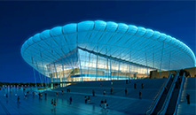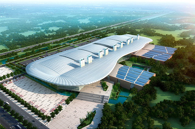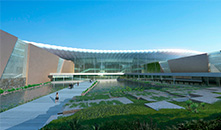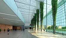 CMMAEC Convention Center The new Convention Center, located next to a landscape park, is part of the new Luogang Business Park development plan in Guangzhou, China. The immediate image of the Convention Center as seen from the highway will be of a white, translucent "Cloud" roof floating gently above the exhibition halls and surrounding landscape. This impression is enhanced by a strong landscape connection between the building and the park to the East and the river to the West which is integral to the concept of the building. The natural relationships between water, land, and sky, familiar to all people, inspire and provide the design concept the new Convention Center. These relationships and the resultant design solution are manifest in technical energy efficient solutions, sensitive response to ecological imperatives and requirements, programmatic functionality, and spatial/architectural iconology. Ultimately, the elements coordinate on all levels to provide a high performance building seamlessly integrated into the landscape and, above all, a humanistic experience for all who inhabit the Convention Center.