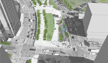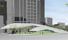 Harbor Island Pavilion The pavilion is a passage through a landscape, an island emerging from the urban environment. One senses the Greenway momentarily transformed to reveal this other landscape. A topographic map reaching to defi ne itself as existing beyond the current urban surrounds. This materializes first as an interpretative beach garden with the shore of the island that is the pavilion. This landscape transforms and changes scale into an edge, a dune lifting and rising. You now enter the space the pavilion proper, and here the dunes are retained between granite sea walls, or abandoned fortifi cations. The passage flows through a channel; you have left the Greenway and passed into the harbor and islands. The program appears as eddies along this passage, the presence of the organizing topography overhead. This materialized topography is further strengthened by the tension structure that holds the lip of the dune, the roof. The clear, clean edge of the materialized, built contours feel suspended by some invisible cartographic grid or unknown chart. The closure between the walls is minimal: wood, light, airy and seasonally operable. The glass wall becomes a gentle glow at night, defining the captured contour, and a projection screen for images and information on the Harbor Islands. This edge disperses, the moment is gone, and another passage begins. |