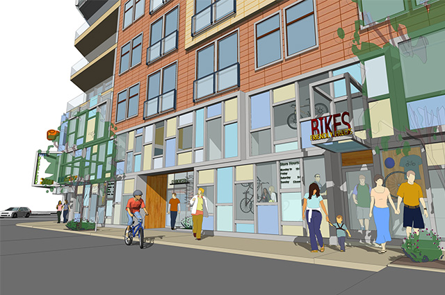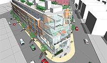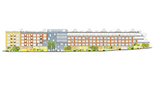 Distillery Redevelopment This project is a sustainable mixed use redevelopment of a masonry constructed former 1840 rum distillery which will provide live-work and studio spaces for artists and small manufacturers. The two 5-6 story building wings provide approximately 60 living units oriented to the south and form an inner courtyard creating a garden for the community. The individual units share an atrium which provides daylighting to the interior zone of the fl oor plan. An optimized skin and passive solar measures combined with geothermal and cogen energy exchange will decrease energy consumption by 85% compared with that of a standard apartment building. The vision of the project team was to bring this 70 unit mixed-use complex below "net zero" energy consumption. |