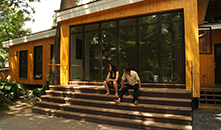 The Old Oak Dojo was recently awarded Full Living Building Certification, being the 9th in the world, and the 1st in Boston, MA. This is the most rigorous environmental building including Zero Energy & Water management, Urban Agriculture and intensive exclusion of toxicity in materials. The program requirements resulted in extensive use of reclaimed materials from an original shed, a large stage set (Grown-Ups II) and an array of salvage and re-purposed materials with only mechanical equipment and windows being purchased new, but from regional sources. For a full understanding of the requirements of the Living Building Challenge (LBC) please go the case study on the ILFI (International Living Futures Institute) website at LBC Case Study Early on, discussions between Next Phase Studios and the owner (an Environmental author) on how the project could be regenerative in its environmental impact, instead of consumptive led to the pursuit of the world’s most rigorous and ambitious performance building standard, the Living Building Challenge. The LBC is composed of seven performance groupings called Petals: Place, Water, Energy, Health & Happiness, Materials, Equity and Beauty. The main intent of the Certification is to have the facility be low impact or even restorative of the environment, meaning supplying all energy on site and with NO combustion, treating all on-site waste (compost toilet/greywater systems), and using only low toxicity and regional materials (a major feat in a global construction supply chain). Food is a catalyst for bridging differences, elevating social equity, and bringing people together to create healthy and resilient communities. Urban Agriculture is a required aspect of the LBC and at the Old Oak Dojo. The owner and community were faced with two big challenges: contaminated soil and limited sunshine. They partnered with two local permaculture gardeners to design beds that would best address the challenge of limited sunshine due to tree cover. Raised beds were constructed using cinder blocks (left over from Dojo construction) and reinforced with scrap iron (left behind on the old shed). Three of the beds are cultivated by Dojo members; the fourth was offered to neighbors as a community plot. They primarily focused on crops that can tolerate cooler temperatures and shade, such as kale, chard, mustard greens, lettuces, scallions, carrots, radishes, and herbs. The beds with the highest sun exposure have tomatoes, melons, cucumbers, and peppers. Reused rainwater is stored in cisterns and used for irrigation.