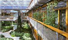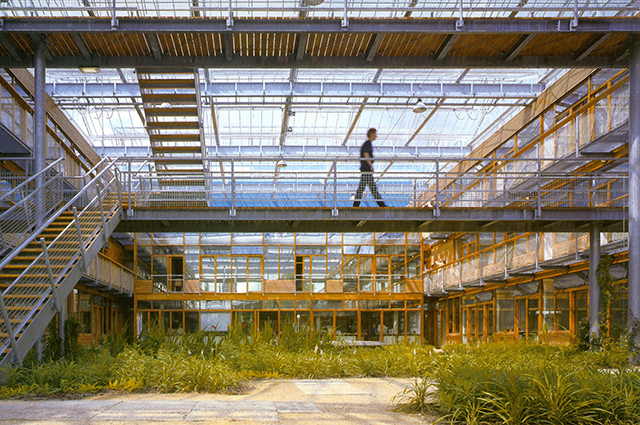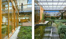 IBN Institute of Forestry + Nature Research This design fulfills the University in Wegeningen's vision for a cutting edge sustainable pilot project for their Institute for Forestry and Nature Research. Given a context typical in the Netherlands, the building's site is flat and over cultivated next to clusters of greenhouses. The project introduced a very ordered “system” based on a series of gardens to clean on-site water, soil, and provide substrate for various plants species. Some of these gardens are enclosed to support a Mediterranean climate for specialized plantings and a comfortable user work environment. The centrally-featured indoor gardens are nartually conditioned and promote a setting for research and informal gathering. Users of the IBN Institute can potentially show how sustainable landscaping and an ecologically sensible use of nature might be realized without extra costs. The project was not only a pilot with regards to ecological aspects and user and evironmentally friendly building, but also with regards to the procedures and integrated planning strategies implemented in its realization.
