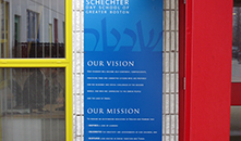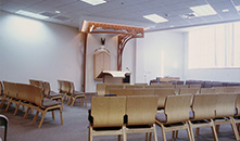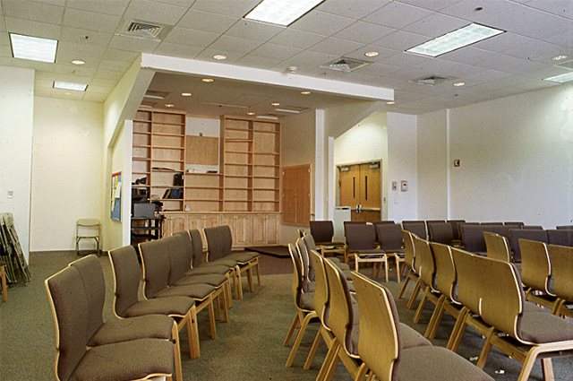 Solomon-Schechter Day School This interior renovation converted a large meeting room into a chapel space with a new circulation and an adjacent reading and study area. The orientation and function of the room was changed with extensive lighting, material and finishes introduced with a minimum of actual wall and room changes. The new work is flexible and dramatically adaptable for the various sizes and needs of the groups using the facility. |