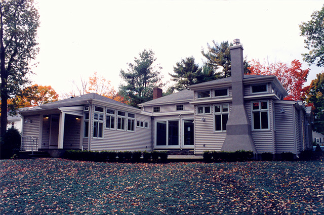 | Residential | Meadowbrook Road Residence Comprehensive design, approval, and construction administration services for an addition and renovations to an existing suburban residence. The existing house was a prototype in this established neighborhood and benefited from a significant rear yard which joins onto conservation land. the clients wanted to take advantage of the remarkable site and landscape in the rear while minimizing the impact of the addition from the street. The design solution required signifi cant technical coordination to open up the first floor plan and accomodate the connected pavillion additions. The renovated house remains unchanged from its neighbors on the street. The addition consists of common and private pavillions connected to the landscape by an exterior terrace and careful window placement which maximizes access to daylight, natural ventilation, and an open feeling throughout the expanded first floor. |